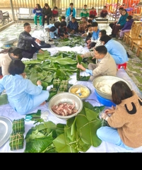 Ảnh các ông bà, các em khuyết tật, cán bộ Trung tâm cùng nhau ngồi gói và nấu bánh chưng